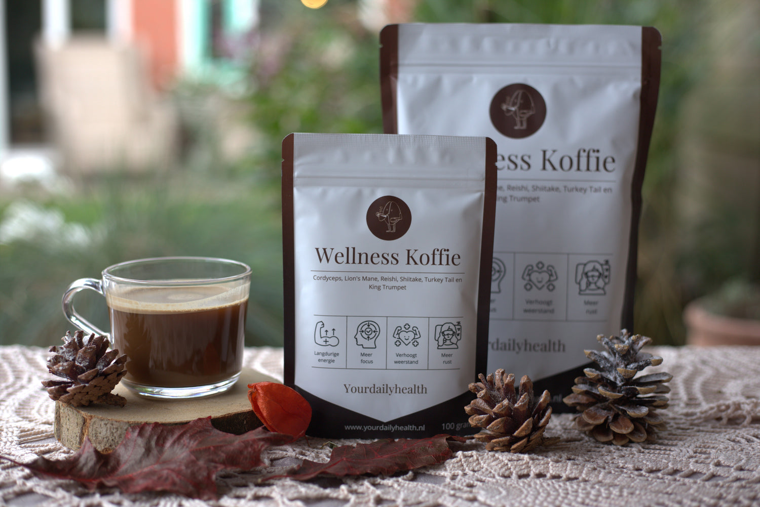 Wellness Koffie is een Arabica koffieblend met functionele paddenstoelen zoals Lion’s Mane, Cordyceps, Reishi, Shiitake en King Trumpet. De combinatie ondersteunt energie, focus, stressmanagement en algehele vitaliteit.